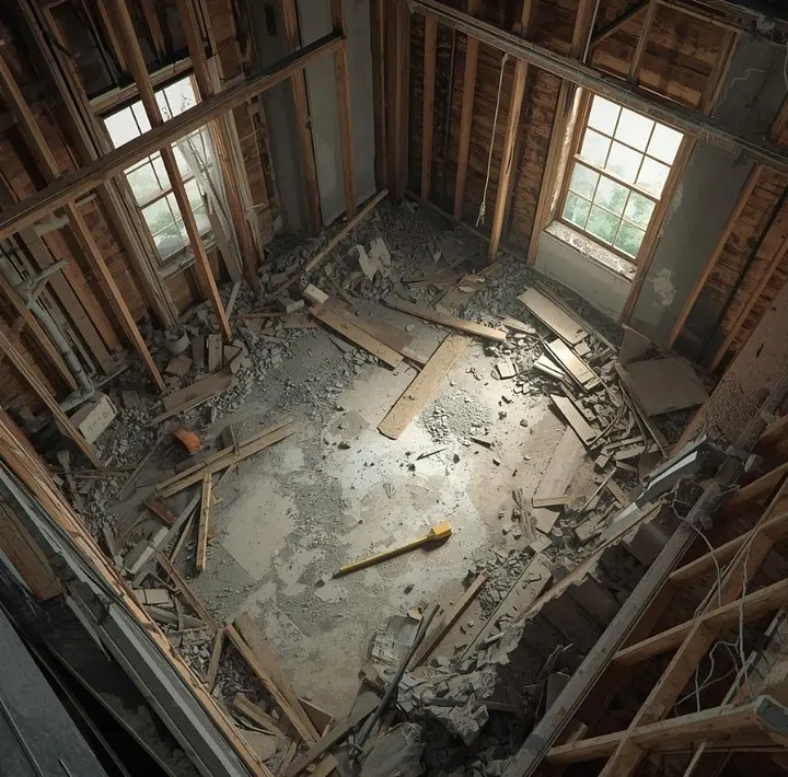 Complete interior demolition including cabinets, flooring, drywall, and fixtures removal.